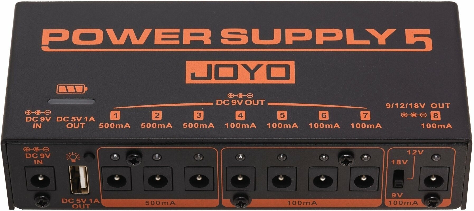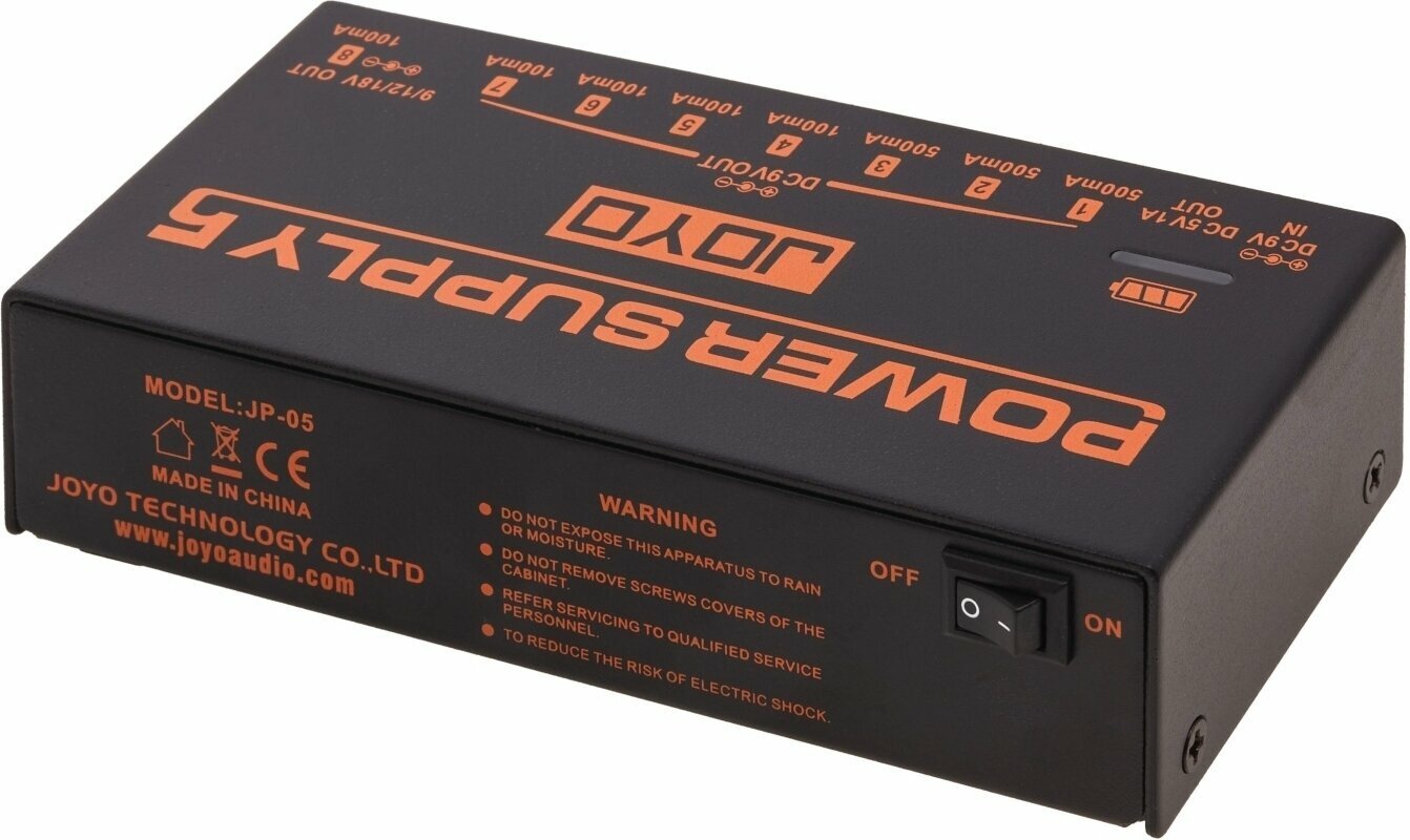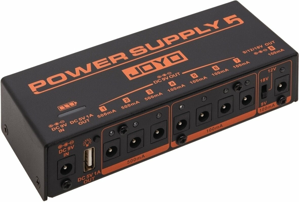 Napájací zdroj JOYO JP-05 má 8 jednosmerných výstupov a 1 štandardný USB výstup, jeden z 8 výstupov možno prepínať medzi 9V, 12V a 18V pre rôzne pedály vo vašej zbierke, ktoré potrebujú len trochu viac napätia. 5V USB výstup vám umožní napájať váš mobilný telefón, iPad a ďalšie prenosné zariadenia.
