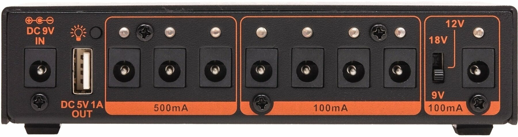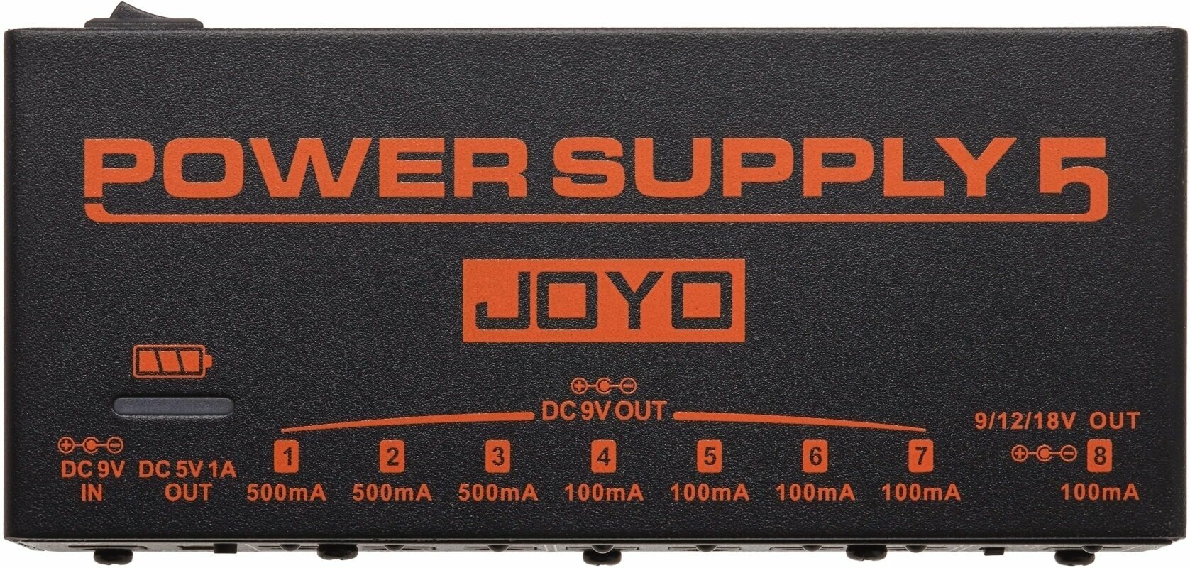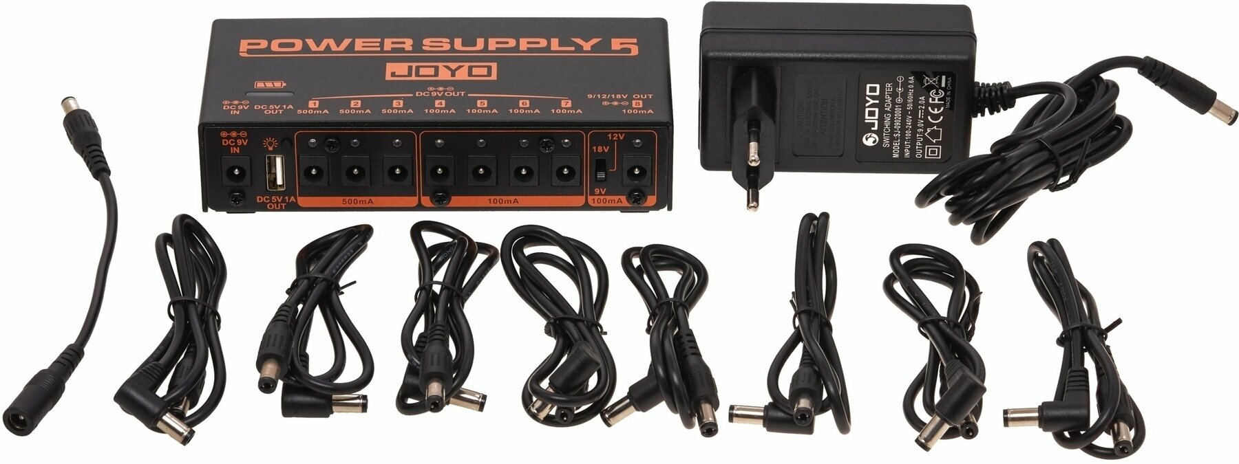 Napájací zdroj JOYO JP-05 má 8 jednosmerných výstupov a 1 štandardný USB výstup, jeden z 8 výstupov možno prepínať medzi 9V, 12V a 18V pre rôzne pedály vo vašej zbierke, ktoré potrebujú len trochu viac napätia. 5V USB výstup vám umožní napájať váš mobilný telefón, iPad a ďalšie prenosné zariadenia.