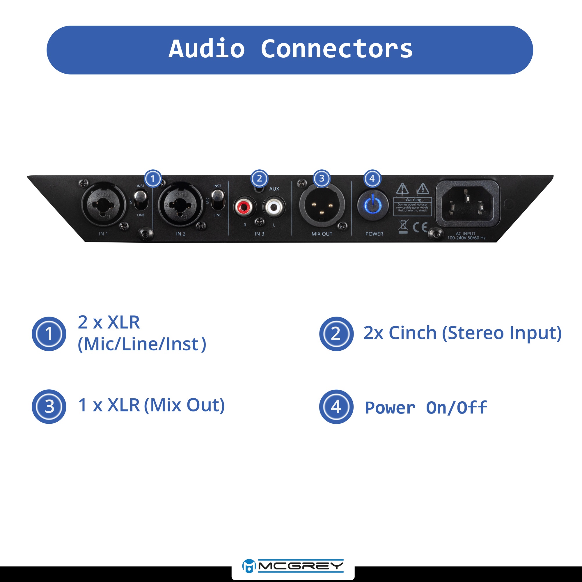 - Vstupy: 2× XLR/line combo, 2× phono (cinch), 1× 3,5 mm jack